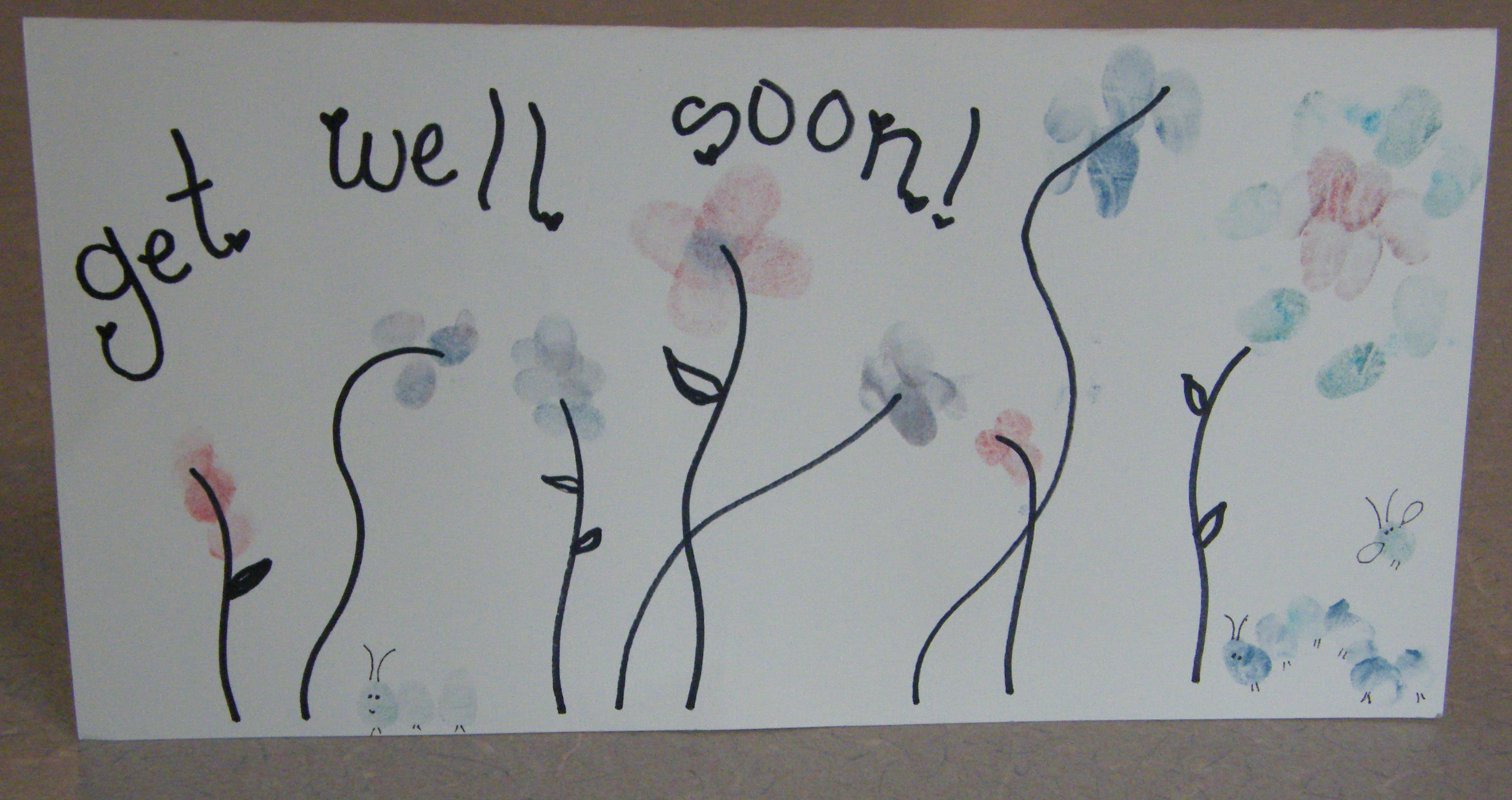 The kiddos and I have been working with stamps lately and when our cute niece had to stay in the hospital I thought we’d do a homemade card for her that they would enjoy creating. Using their fingers to create the flowers and bugs was intriguing to them and a new experience for me. Sometimes it’s hard to just let them create when you know in your mind what the desired outcome could be. I’m trying though. Inside, where we did our writing, I let my son freestyle with his fingers as a background. Not too bad for our first try. I hope she enjoys it. 🙂