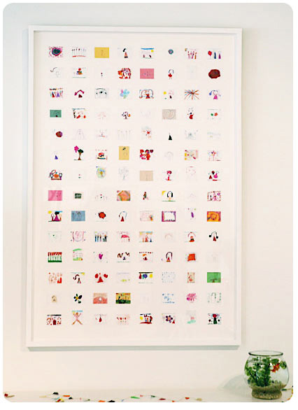 Have you seen this gorgeous kiddo art collage by Jan Eleni?  I spotted it in a guest mom’s post on Design Mom, and think it is absolutely charming…so I’m going to make one each year for my husband!  He just had his birthday this week and I had the kiddos do some birthday paintings for him.  After my son’s painting was dry, he insisted on rolling it and gift wrapping it for his dad.  My husband has it hanging in his office at work.  So I thought I’d do a collage for each year, displaying our kiddo’s art.  I’ve taken pictures of quite a few of their pieces already, so I just need to get into photoshop and get going.  I’ll let you know how it turns out.