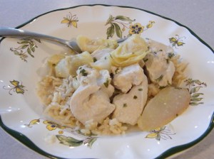 In a large saucepan, simmer all but chicken for 15 minutes, while cutting the chicken. Add chicken and cook on medium heat for 6-8 minutes, or until chicken is cooked thoroughly. We ate it over brown basmati rice. Serves 4.