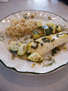 To make sauce, combine all but tilapia and capers. Warm the sauce and add tilapia fillets. Cover tilapia with capers. Cover and saute on medium about 10 minutes, turn fillets and cook, covered another 2-3 minutes. At this point I added zucchini to the pan. Sprinkled a bit of salt and basil on the chopped garden zucchini and covered another few minutes with the heat off. We enjoyed it with brown basmati rice and sliced fresh peaches . The kiddos loved it too (served our family of four eaters).