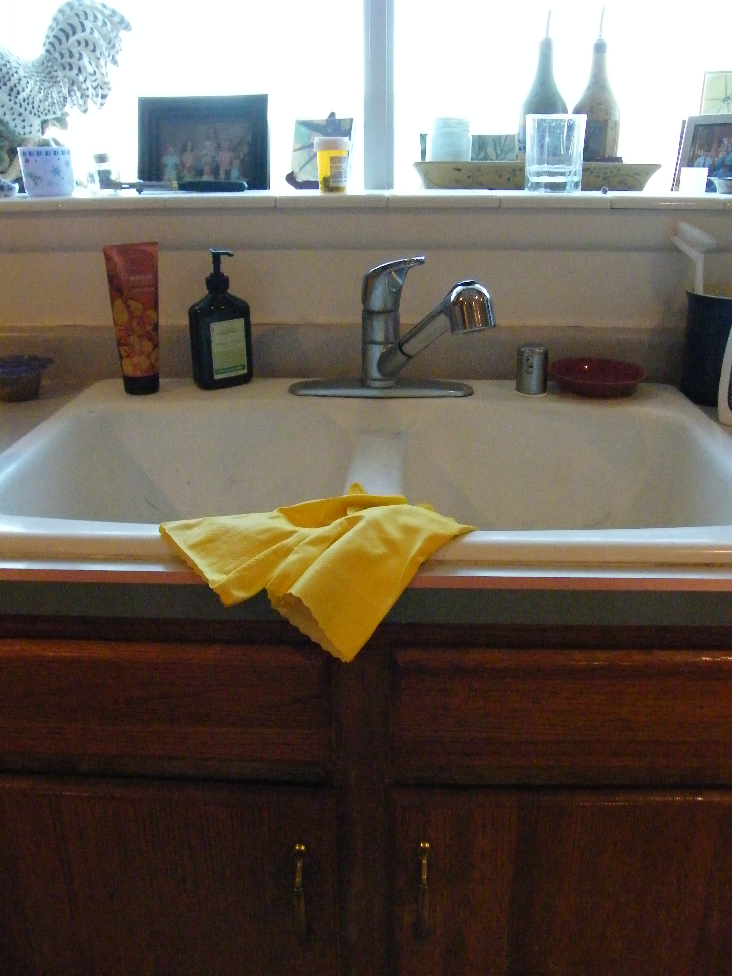 Doing the dishes after dinner with my new ‘hand savers.’ I looked down at their brightyellow-ness and thought to myself, “I am totally my mother!” Just then, the designer came around and began to laugh. I turned to see if he was laughing at the gloves, and he said, “You’re officially a housewife now.”