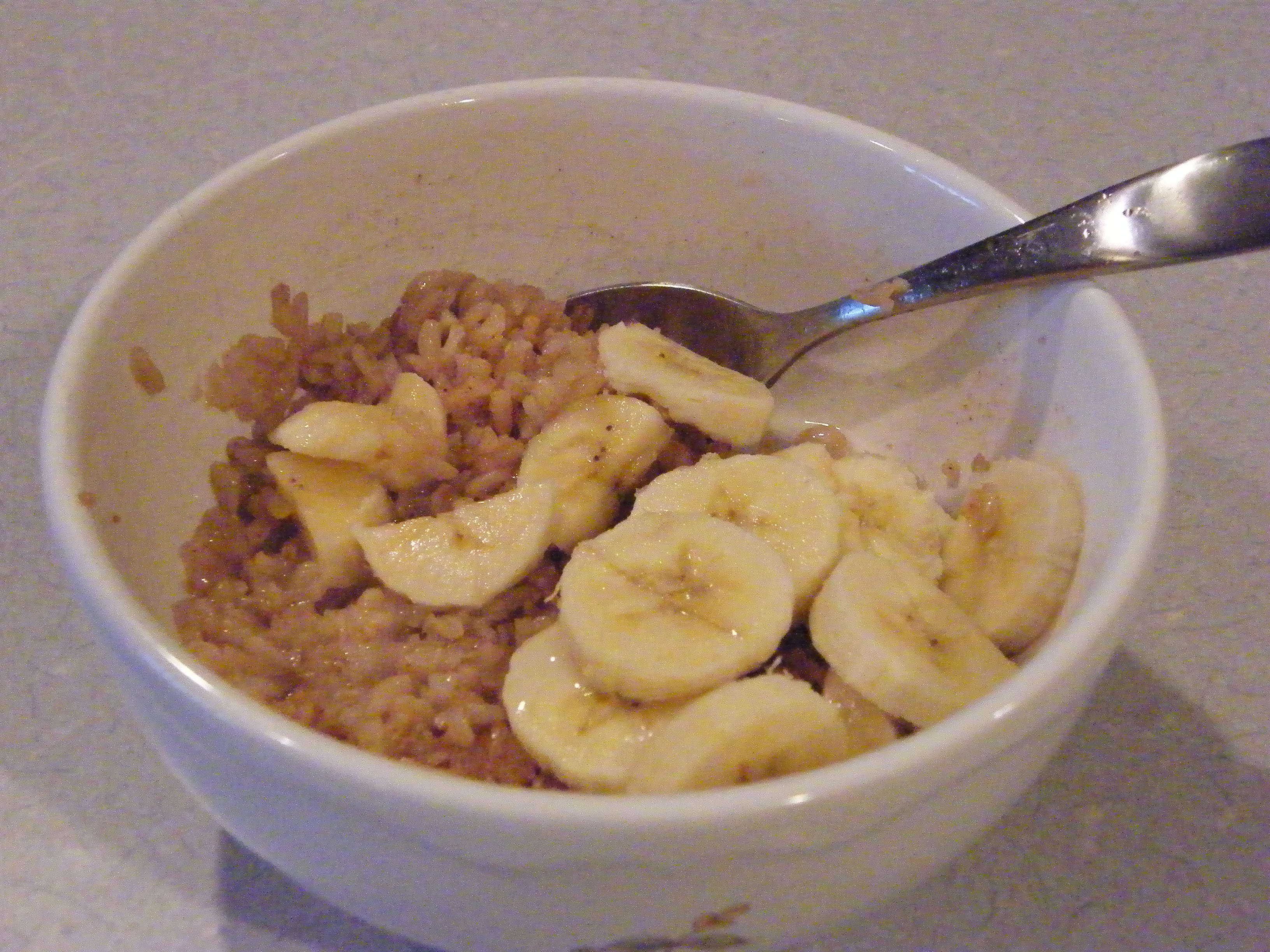 About a year ago, I was introduced to rice as a breakfast cereal by by friend Leslie. We ate it for a while, but then the prego nausea didn’t like it, and I had forgotten about it till yesterday morning. I took the brown rice that was left over from dinner the night before and heated it in a pan on the stove (just like oatmeal). Here’s the recipe if you’d like to give it a try: