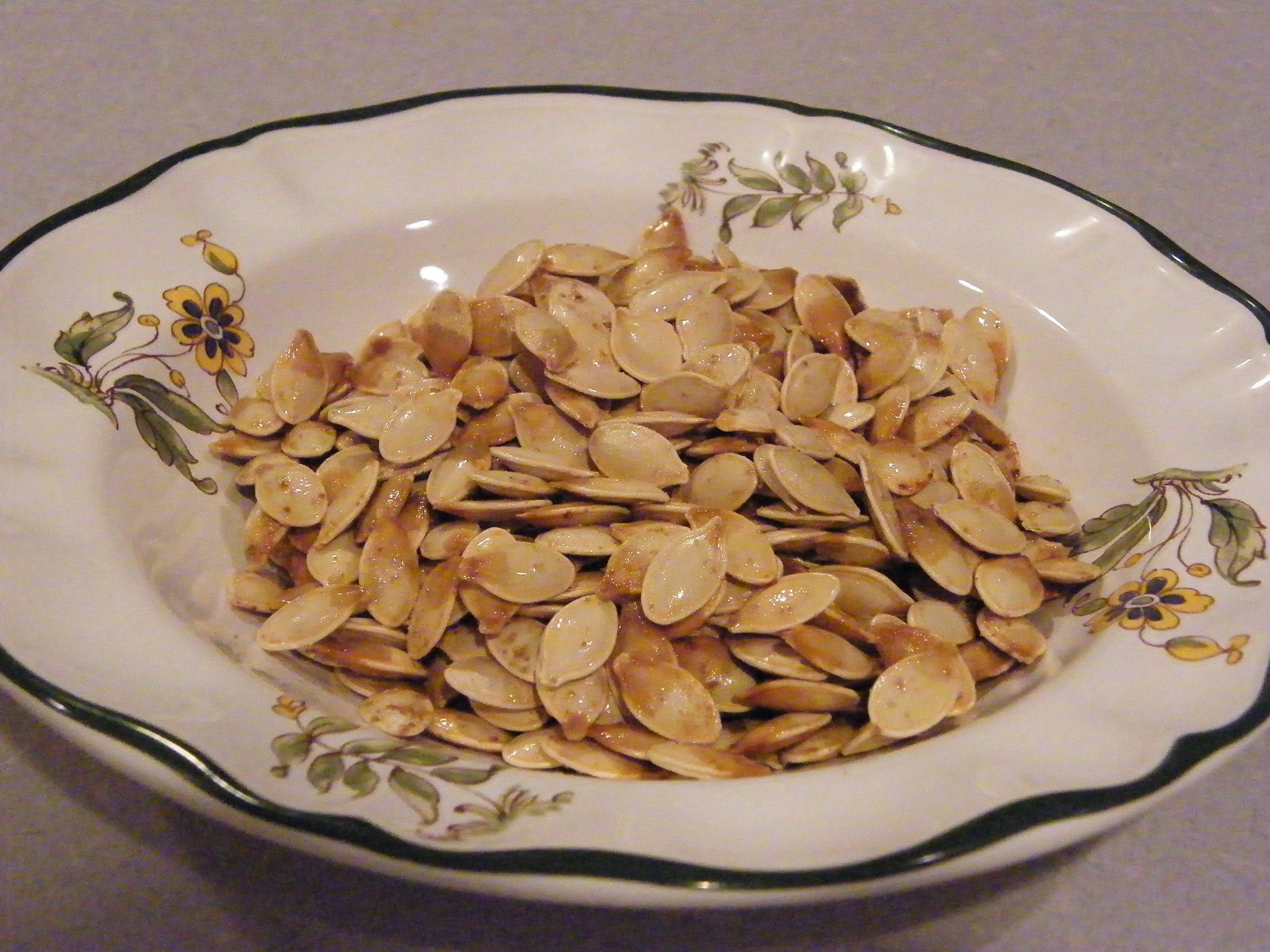 The designer carved a really cool pumpkin tonight with the kiddos. I was busy cleaning the seeds to bake. We tried to dry and bake them last year, but we didn’t know what we were doing and finally gave up. This year we were smarter. I looked up a few recipes online and came up with this one: