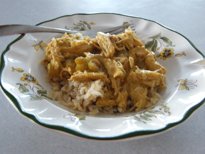 Cook all in crock pot on high for 3-4 hours, or 6 on low. The last hour or so, shred the chicken to absorb more of the delicious sauce. Serve over rice. (this tasted really great the next day at lunch in tortillas with parmesean cheese melting on top).