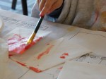 After we finished our activity inserts, I glued the envelopes shut with a glue stick, so when the envelope is turned vertically, the top is open.  We then began painting both sides of the envelopes in hues of red and green.  We used paint brushes, our fingers, and did a bit of print making as well.  I let them do whatever they wanted, and we all enjoyed ourselves.