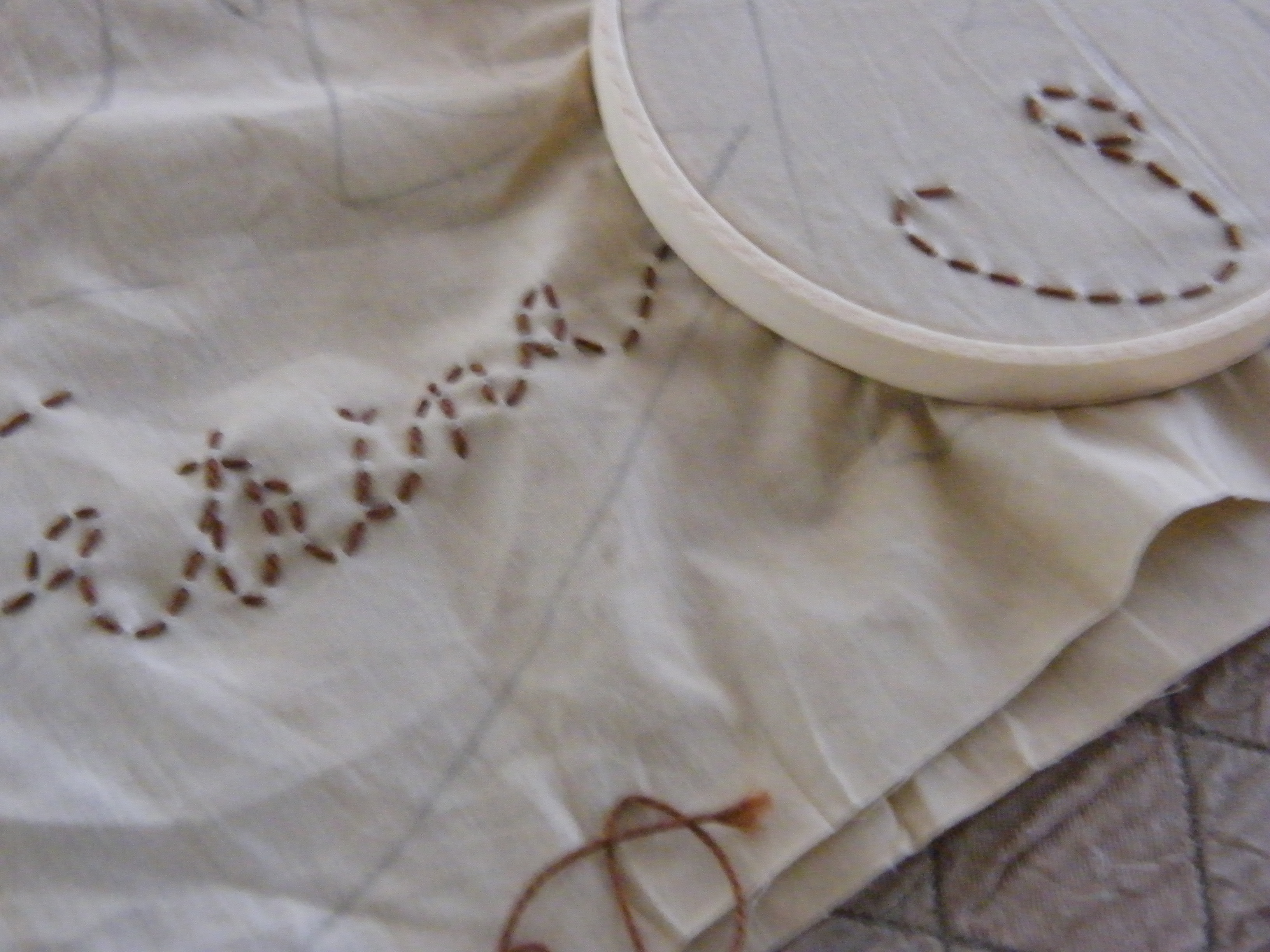 As my stocking saga continues, the designer’s mom again came to my rescue. Last night she was there as I began my first embroidery project. The closest thing to embroidery that I’ve done were the needle point projects we made in Mrs. Pruett’s 3rd grade class. (Smart lady, keeping our lil’ hands busy working on various projects). I’m embroidering name tags that I will be attaching to the stockings. Hopefully I’ll finish them this week so we can hang the stockings!
