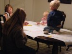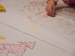 The neighbor girls, McKenzie and Emily were over this afternoon, stayed for dinner ,and joined in our advent activity. As I washed the dishes, the designer helped the kiddos draw Christmas scenes with the Cray-Pas oil pastels. They are similar to crayons, but come off so much smoother. You can blend them, and even scratch designs in your color. The color is brilliant, and it’s been our favorite medium as of late. I found a new pack for the kiddos stocking at Utrecht in SLC on black friday. It was on sale, and you can buy a pack of 25 online at Utrecht for only $2.99. After we were done, the kiddos immediately wanted their creations hung in their toy room. I’ve hung more twine on the white walls with left over advent clothespins to hang their latest artwork.
