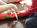 A wrapping adventure with auntie Dez. I warned her it would be a mess. I think it is hard to imagine life with three small kiddos until you’re in the thick of it. 🙂 But as she said, “I’m just rolling with it!” She was so patient with the builder and let him wrap with her. The dancer was happy cutting and tearing. Later, Dezzer was wrapping a blue rubber ducky for the kiddos, and the dancer wanted to hold it (she had already seen what it was), the builder wanted to open it (thus the reason our wrapped presents are not under the tree…). We convinced the builder to go hide in his room so that Dezzer could wrap something for him. He was so excited. The energy was bouncing out of him as he bounded back to his room. We got quite a kick out of him. Oh the joys of little ones and wrapping!