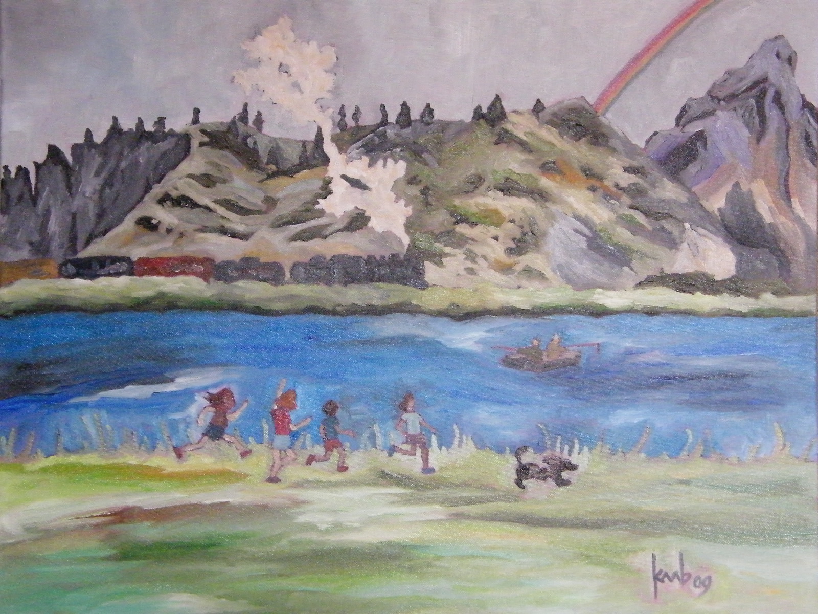 Remember Kari’s favorite spot? Well let me remind you…a riverside paradise of her grandmothers. Summers spent outdoors with family…cousins, and her sister. As the train would approach, they would run out to greet it…following it as long as they could, the dog running along side. Fisherman would wave and enjoy the sight. A gift for Kari’s mom, I hope it will bring back those picturesque views and moments to remember with loved ones!