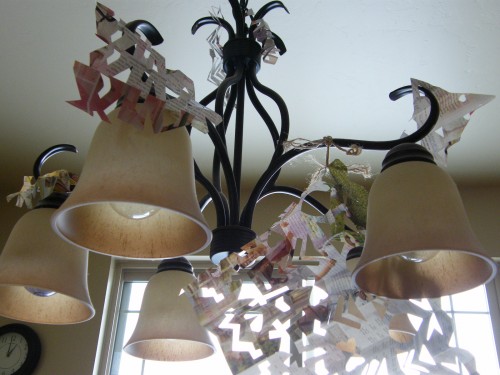 Not sure if we’ll keep them on the chandelier or find a place in the window. 🙂 The scraps we were accumulating had such wonderful shapes to them, I’m inspired to make a paper nativity scene…stay tuned. 🙂