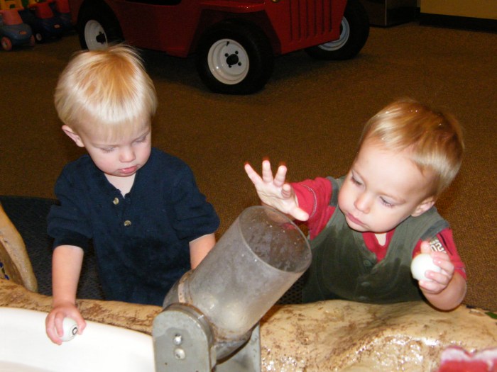 We just returned from another wonderful playgroup trip to the Children’s Museum. The kiddos had a fabulous time…especially the explorer. He spent a great deal of time at the water center: alone, with Jake, with Will, alone again, with the dancer, and finally decided to do some exploring elsewhere. He had gotten pretty wet (as you can see in the photo), so I was glad he was running around trying out the tractor and the farm, etc.