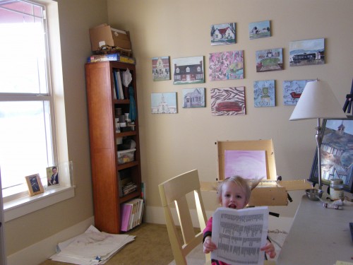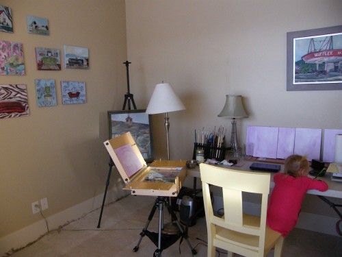 In the Condo I would paint at the kitchen table when the kiddos went to bed, hang the painting on the wall either to dry or to keep from lil’ hands reach until the next painting session. Then my paint box and brushes were boxed up and put away.