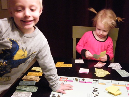 One morning, a few days later, I pulled it down and the kiddos and I spent over an hour learning to play my favorite childhood board game. Of course it was interesting with a 4, 3 and 20 month old. The explorer required playing with the houses, hotels, and one of the die. This proved useful, for we didn’t play long enough to need the houses and hotels, and only rolling one die was much easier for counting and moving. Oh, and we hit most of the spots on the board as we went along.