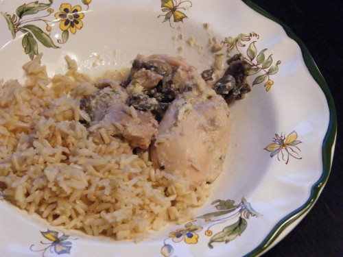 I simmered chicken breasts in the creuset with the left over soup on the stove for about 15 -2o minutes.  I didn’t lift the lid till it was time to eat, so the chicken was very moist and tasted great with some brown rice.  🙂