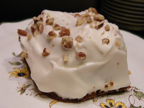 1. Beat all of the above except vanilla and pecans in mixer.  Once small peaks are beginning to form, add vanilla and beat for another minute.