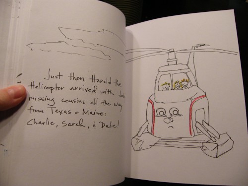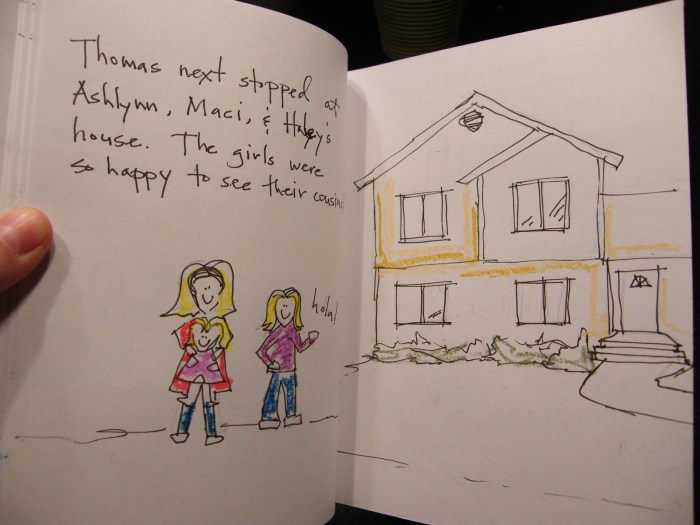 I’ve recommitted to homemade gifts for 2010.  For the cousin & kiddo friend gifts for this year, I bought some blank books to write stories for each child.  The kiddos helped me write the story and then I illustrated it in black ink & oil pastel.  {next time I’m using watercolors so that it doesn’t smear :)}
