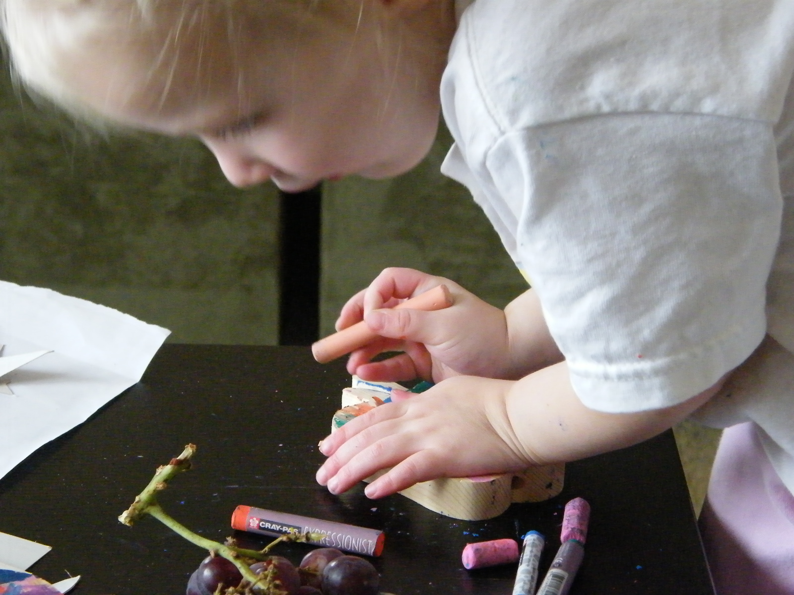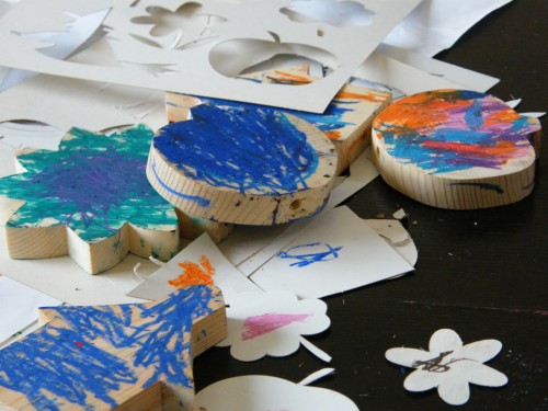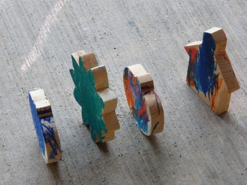 But when they were discovered the next day, the kiddos had plans of their own. They decided to use their oil pastels to decorate the wood blocks. I love what they came up with.