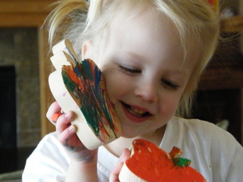 My family came up for the weekend not too long ago. They love surprising the kiddos with things they’ve discovered or stuff my younger brothers no longer use. I was going through a box of my old piano books when I found a stack of wood block cut outs. I set them aside thinking the kiddos would enjoy painting them.