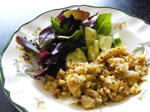 Originally, the menu was for pan-fried falafel. When I went to food process the cooked chickpeas with the onion, garlic and parsley, it was not meshing. Apparently I had not cooked the beans long enough. I added some olive oil. When that didn’t help, the mix was transferred to the Blendtec, where it was improved, but still too crunchy to stick together in patties. But I was craving that falafel. Instead, I cooked the mixture in the pan…just the way it was. Added some spring greens and cucumbers, and it was good. I quite enjoyed the crunch. 🙂