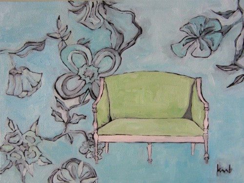 john seymour settee, 9×12 oil on wrapped canvas (sides painted green), wired and ready to hang, SOLD
