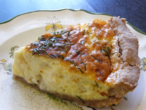 My mom makes a wonderful Quiche. Over the last 6 years I’ve tried to alter her recipe to accommodate my cows milk allergy. Yes, you can use almond milk, but it then requires more egg and cheese, veggies, and it takes longer to cook. We usually let it sit out all evening, put it in the fridge before bed, an d then warm it the next day for lunch or dinner. I have been pondering Julia Child’s recipes, trying to find a way to speed up the process without adding the cream. The other night I used coconut milk and goat brie cheese with her Quiche au Roquefort recipe.