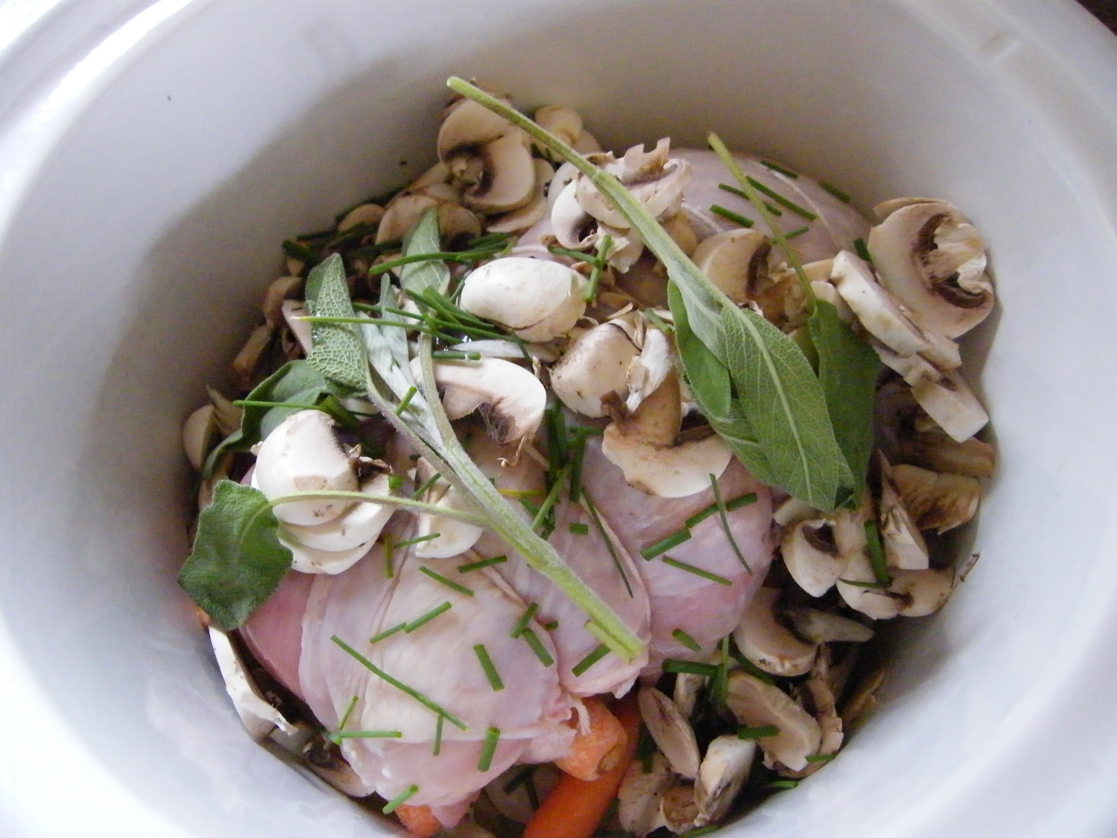 - Cover the bottom of the crock-pot with the olive oil. Place onions and carrots on the bottom, cover with the turkey and then the mushrooms.