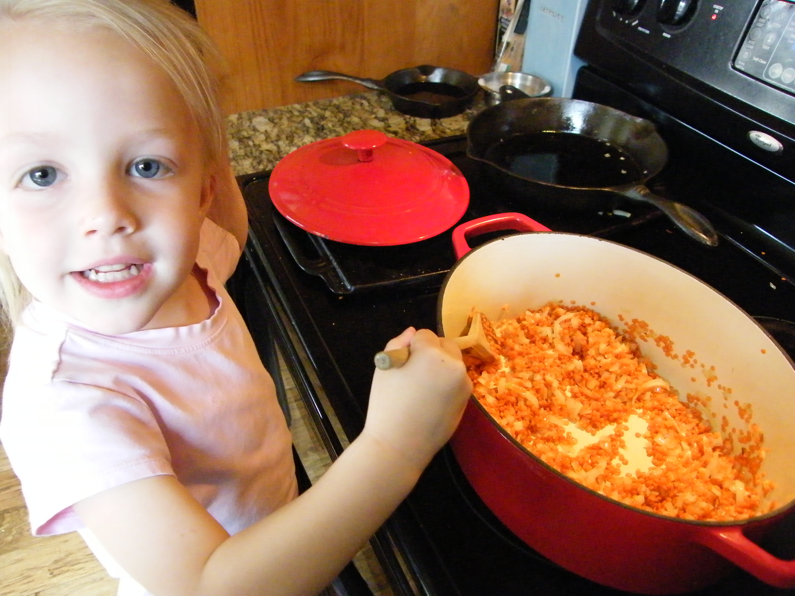 This was ever so simple and easy enough for the dancer to make it with me. She was surprised when her orange lentils turned yellow. 🙂 We ate the filling dish with a piece of toast and I’m full!