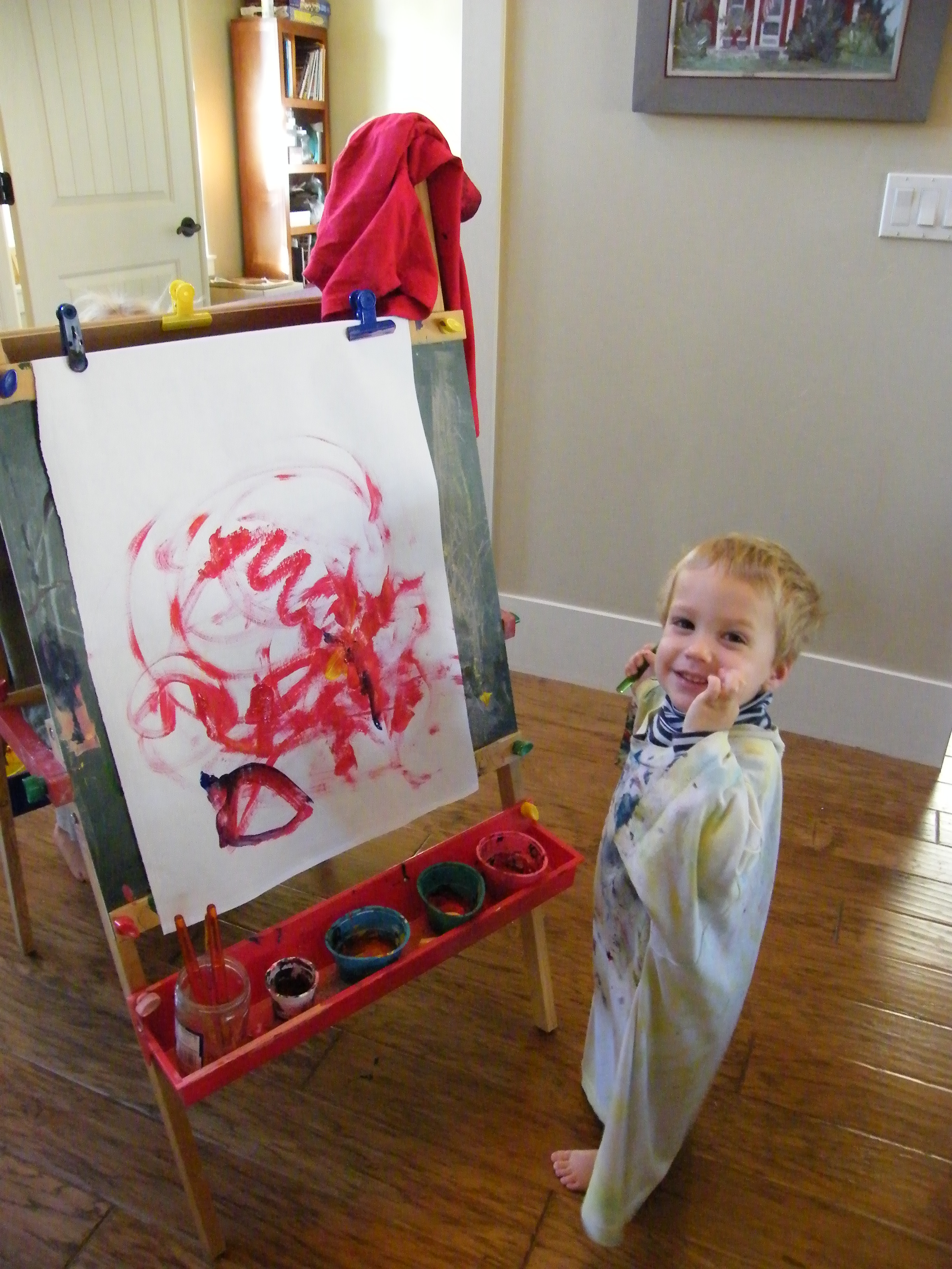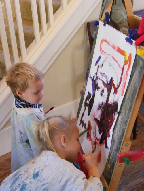 A two sided easel was one of the best gifts we’ve given them.  Now that there are 3 kiddo artists, we go to the table when they are all painting at the same time.  I didn’t get one of the dancer before she moved to paint with the explorer, but here it is hanging proudly on the studio door: