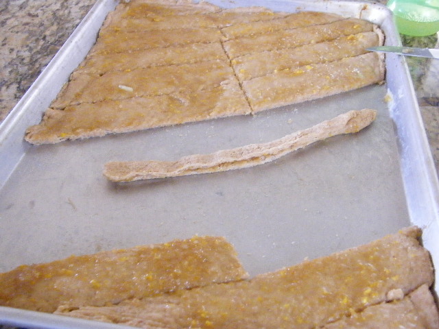 3. In the morning or a couple hours before the dinner, divide dough into thirds.  Roll out dough and paint on orange butter.  Cut dough into strips.