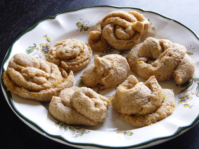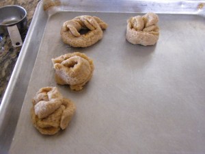 4. Fold and roll and twist strips of dough and place on a greased cookie sheet or muffin tin.  {My mom also paints a little extra orange butter on the top after we form them…she usually makes another batch of orange butter to do this}