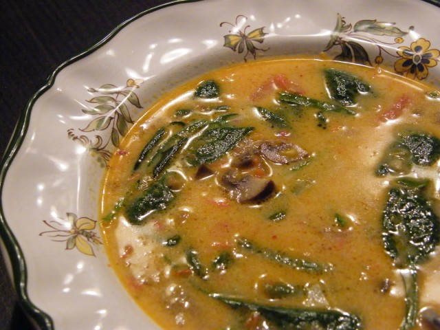 - Add pepper puree and remaining hot water. Stir in coconut milk, spinach, and serve.