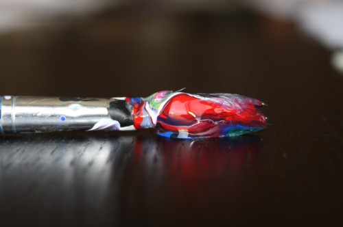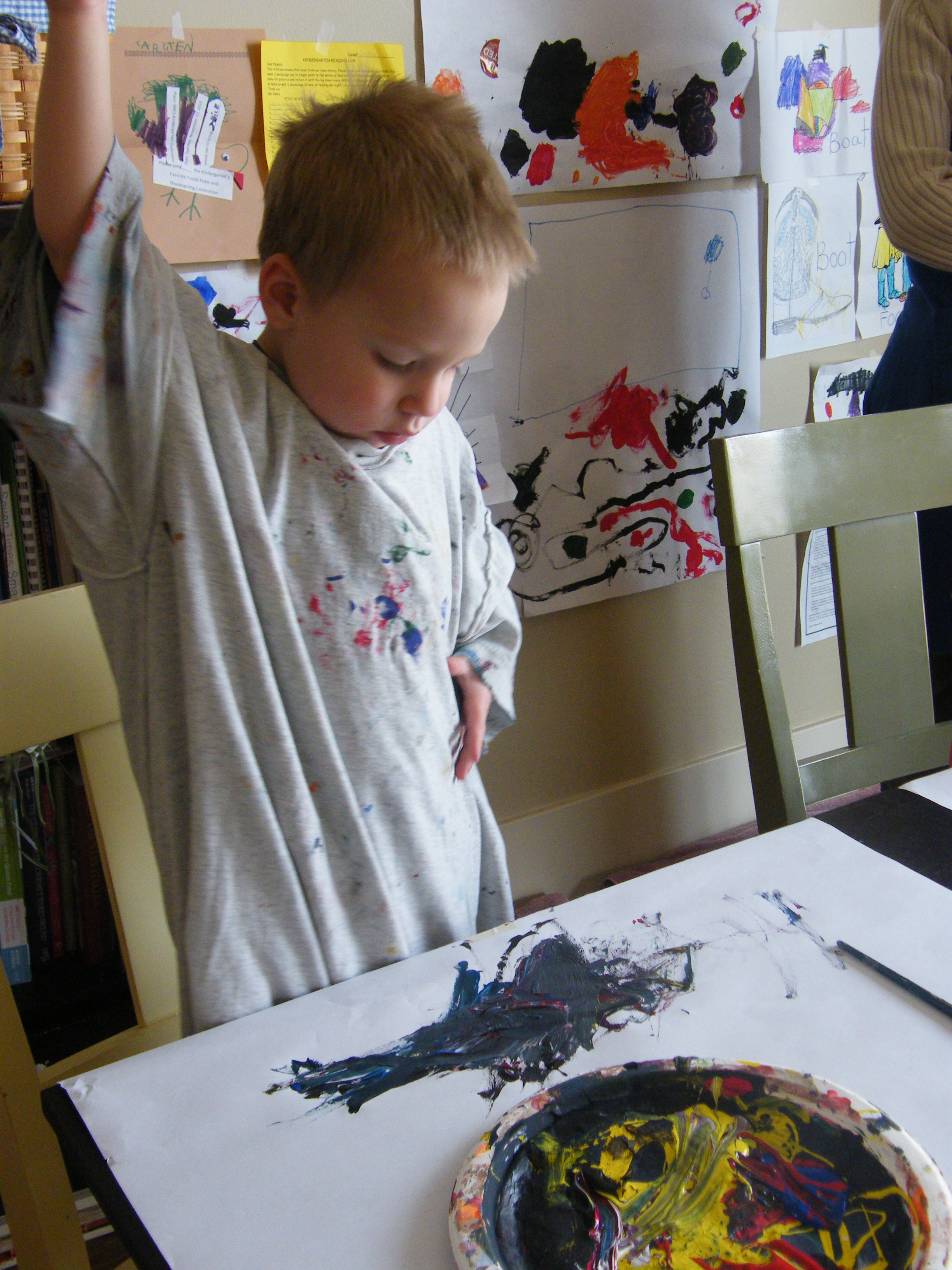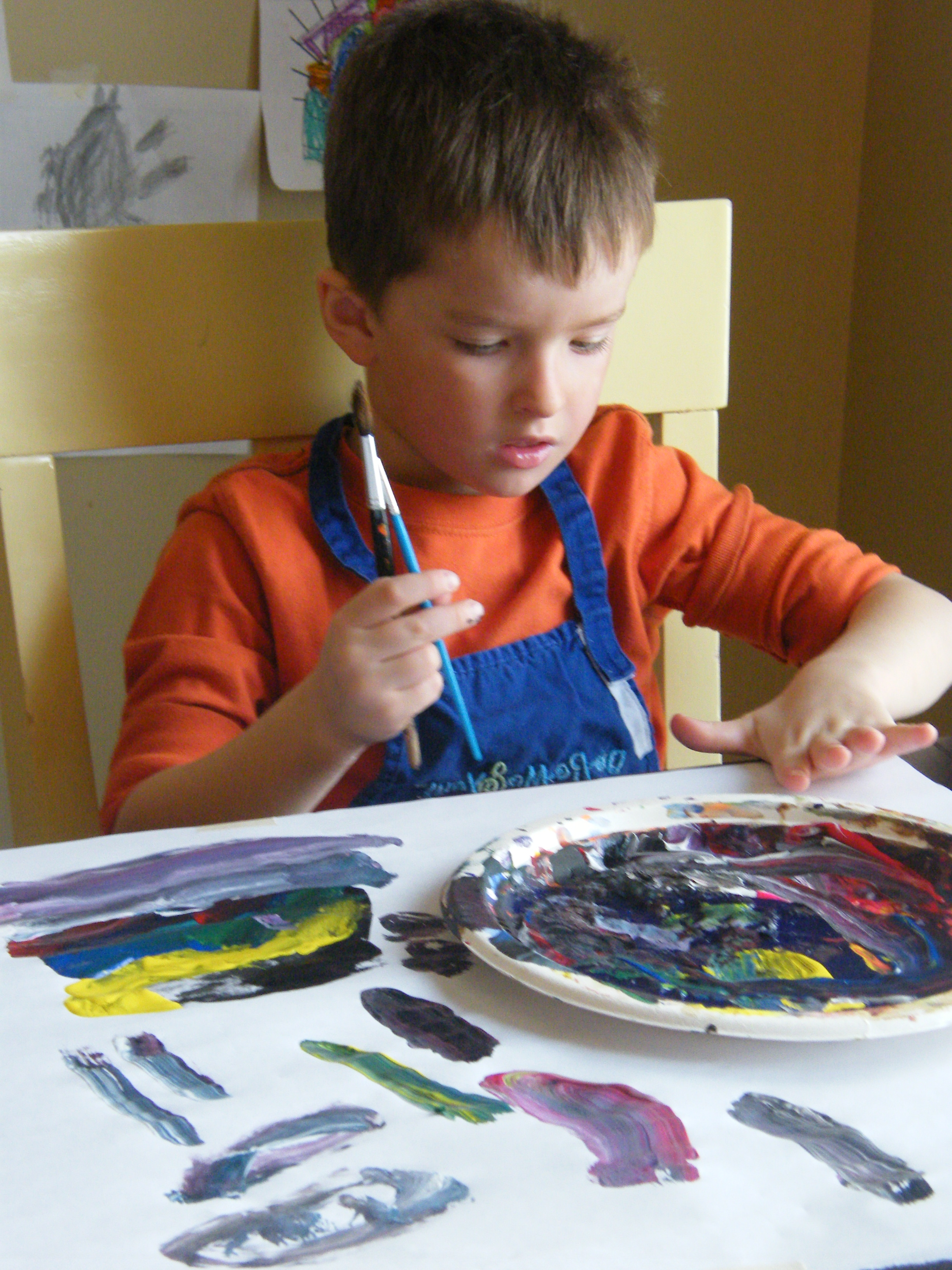 Painting themes at our house seem to back and forth between composition (what and why they are painting), and process {how they paint}. When the builder was small he seemed to mostly focus on the process. It took a while before he had explored enough to desire to paint something in particular. Gradually he built his narrative, and his younger siblings seem to be following in their development.