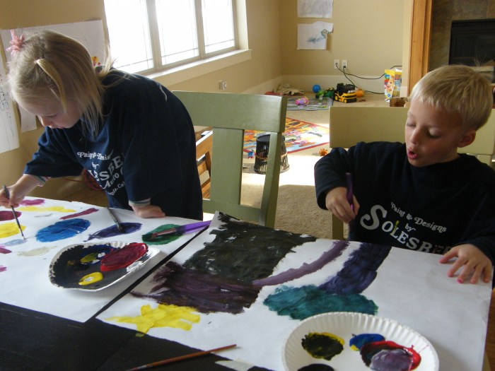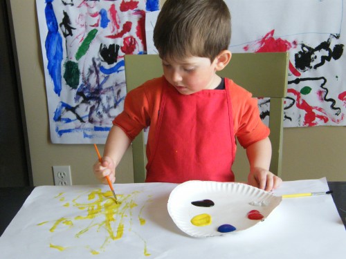 My kids LOVE LOVE LOVE painting. I find that they are still in the “process” phase, ya know, lots of color and not a lot else. I love it. Henry is starting to draw actual shapes though, so I’m assuming it will follow in his paintings.