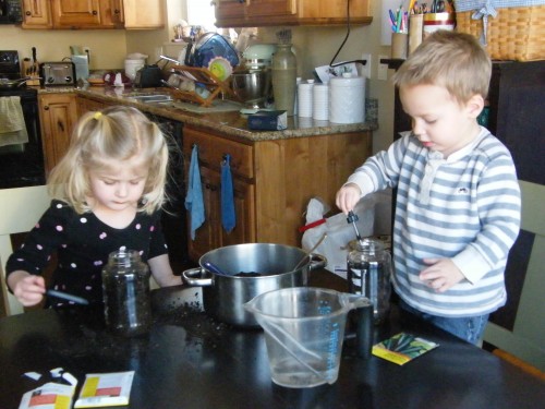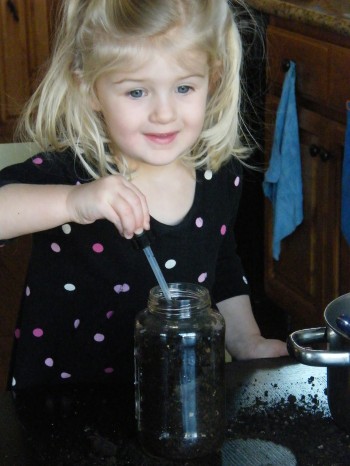 • we planted seeds in glass jars so that we can see our plants’ progress {we also found that droppers were great as the kiddos can water to their hearts content without over-watering, and they are great for making holes in the soil for the tiny seeds and to cover them}