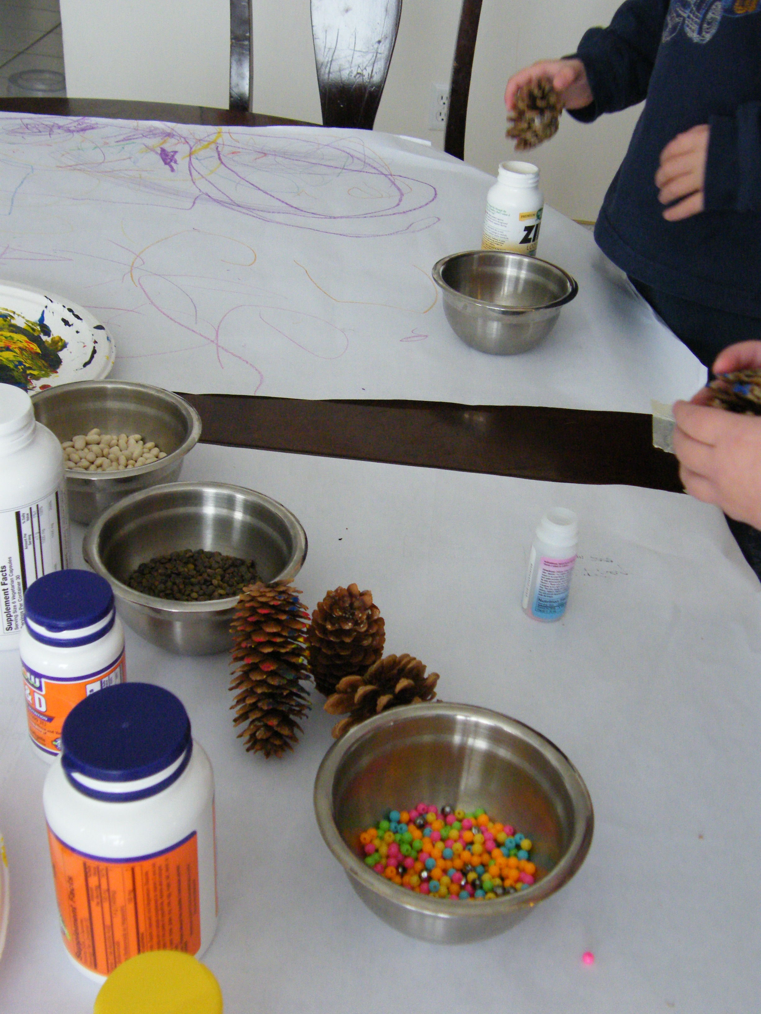 • something to put in your containers (we used lentils, white beans, pine cones, and plastic beads)