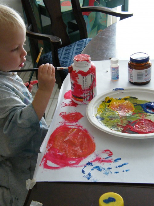I began to glue shut the containers.  Out came the paint shirts, brushes, and paint.  Soon, they were mixing colors to use on the containers and explaining as they went.   After the containers had dryed, the band or parade began.  Can’t wait to use our new instruments as we sing songs together and during preschool.
