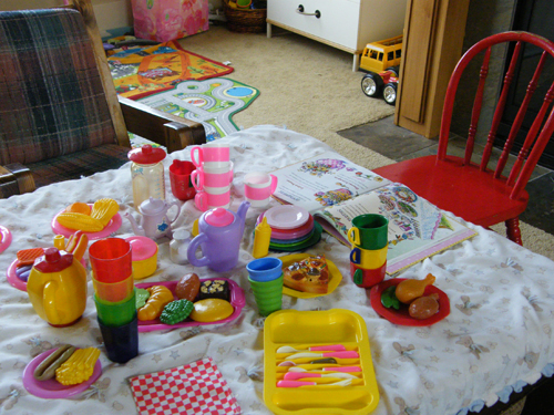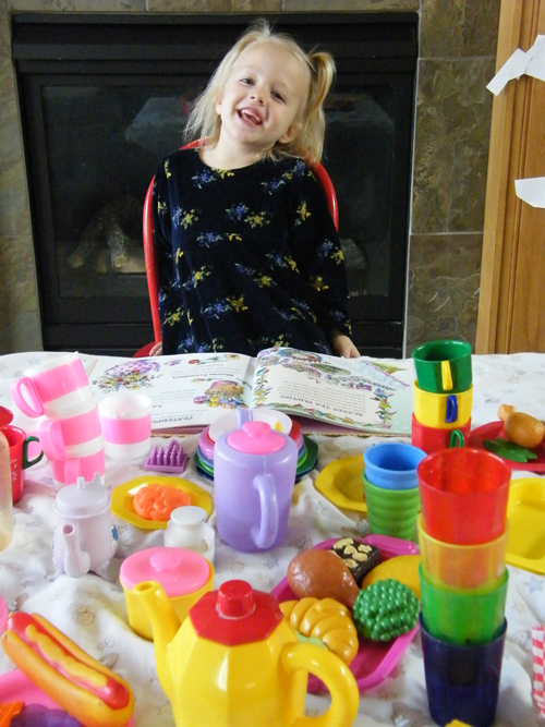 One afternoon, while the builder was at school, the explorer asleep, and I was painting, the dancer created her own literacy-based activity. We’d recently read the book, so she pulled it out, carefully looked through to find ideas, and began setting up her own tea party.
