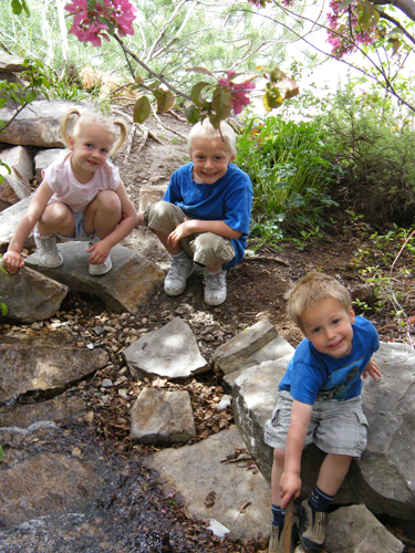 Last week the kiddos and I took a nice long walk to Midway’s Old Town to drop some stuff off at a friend’s. They were really good to walk and help pull the wagon. After we made the drop-off the builder figured out that I could push him inside the wagon, in front of the now-empty-trailer with the other kiddos while he steered the wagon. I pushed them to the designer’s office where we had lunch on Tarahumara’s lovely patio…the kiddos running back and forth to the fountain sheltered with the crab apple tree’s blossoms and shade.