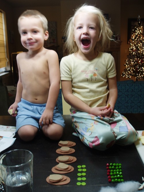 As she looked at the image, she would organize the groups of buttons, bells, and felt pieces in groups of four, two, etc. So that each reindeer was ready.