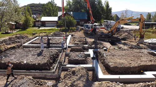 The next day, Paul and the guys were back to finish the rest of the footings…there he is in the middle pouring in the concrete.  Thanks to the very large berms on the edges of the property…we can get a great birds-eye-view of the future home.