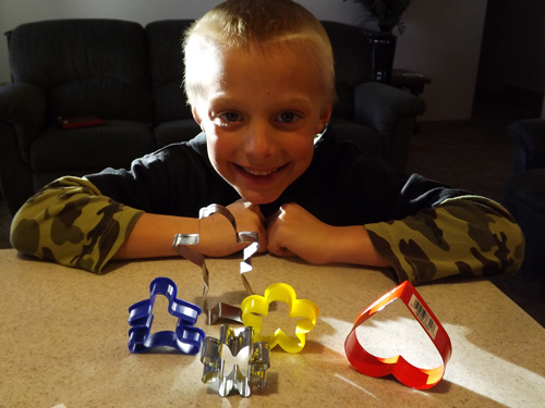 As for the builder, he dreamed of pancakes using cookie cutters. We decided against the plastic…and were left with 3 metal. We learned very quickly that you must spray the inside of each cutter with olive oil before each use. Unfortunately, we also found that colored metal cutters lose their paint when heated…we ended up with beautiful heart-shaped pancakes, each edge trimmed in red. Food for thought for sure.