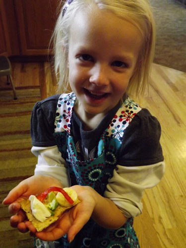 A dancer appetizer: toasted whole grain tortillas (overcooked, which became chips), with fresh mozzarella red pepper, avocado, and banana a top…revolutionary 🙂
