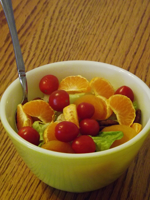 I thought for sure that with the kiddos gone each morning and less creating together in the kitchen…would lead to a lack of interest within those realms. But the opposite seems to be the case. I came up the other afternoon to find a beyond beautiful (and edible) salad waiting to be enjoyed, courtesy of the dancer: romaine, pecans, dried apricots, and cherry tomatoes to be exact. And yes, she’d even cleaned up after herself. 🙂