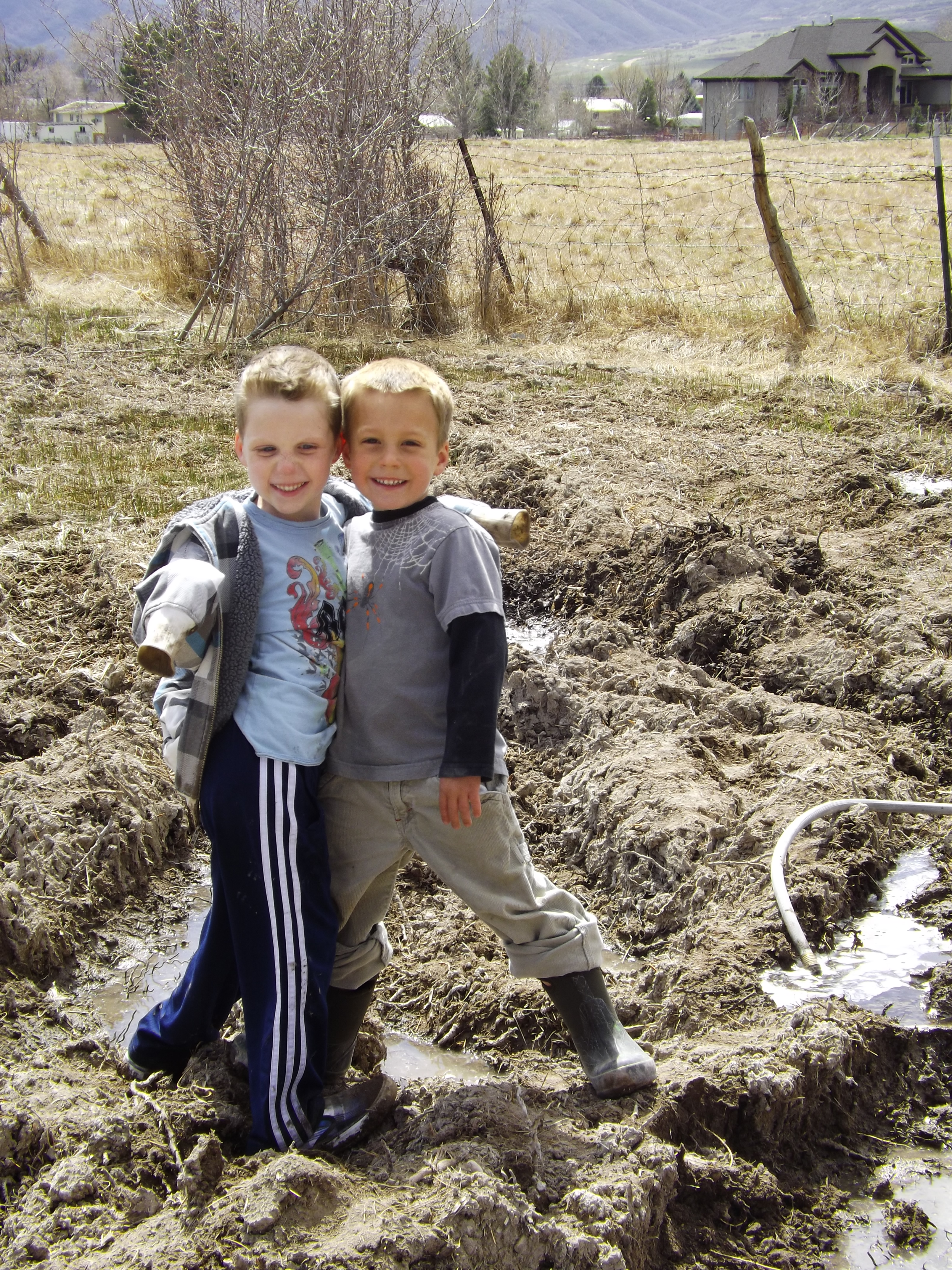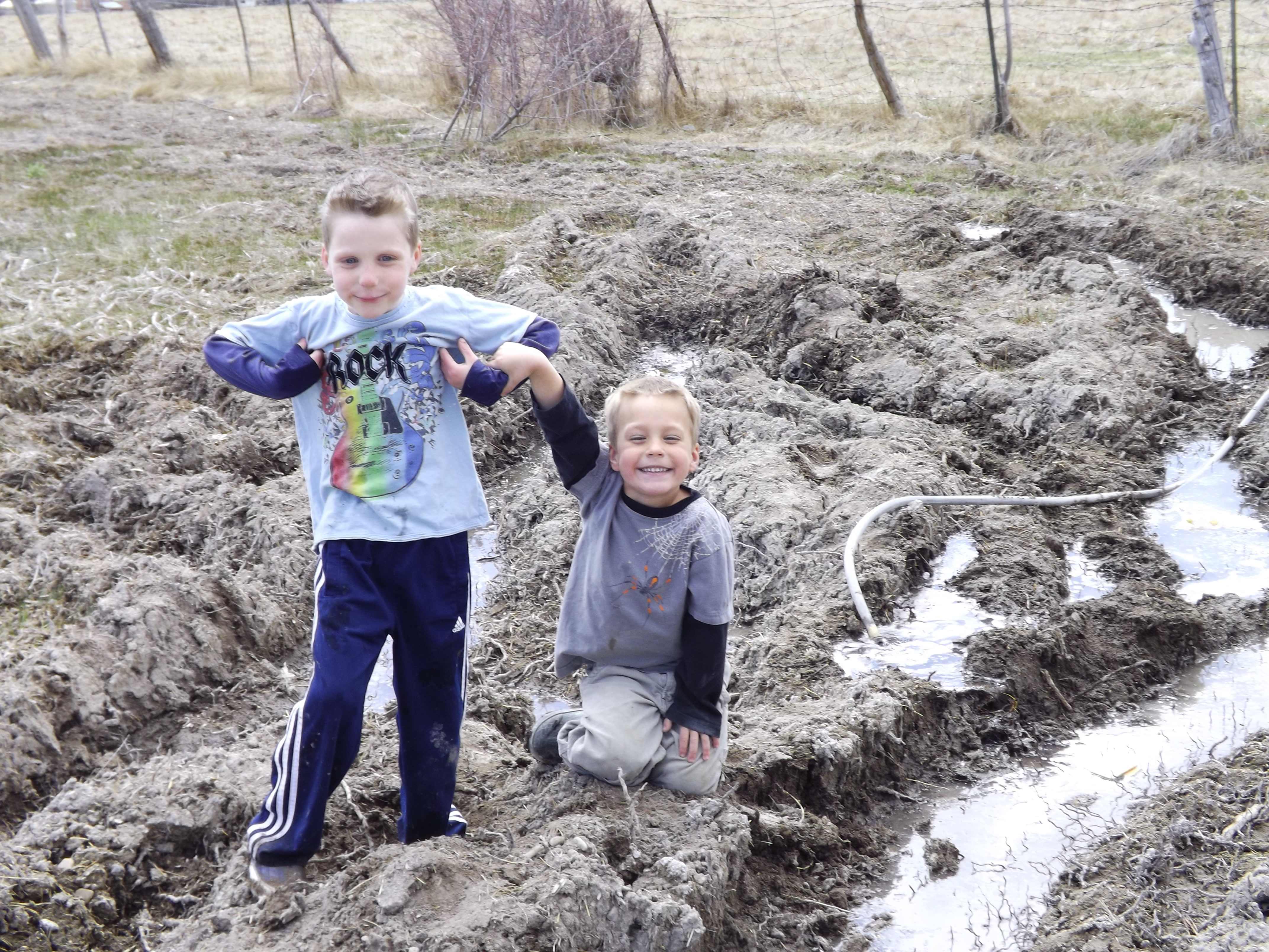 Just last week the explorer joined his cousin in the front yard for an afternoon of joy in river-making. They grabbed the hose and took advantage of the ruts the gas company and other large trucks made in the front yard during Winter.